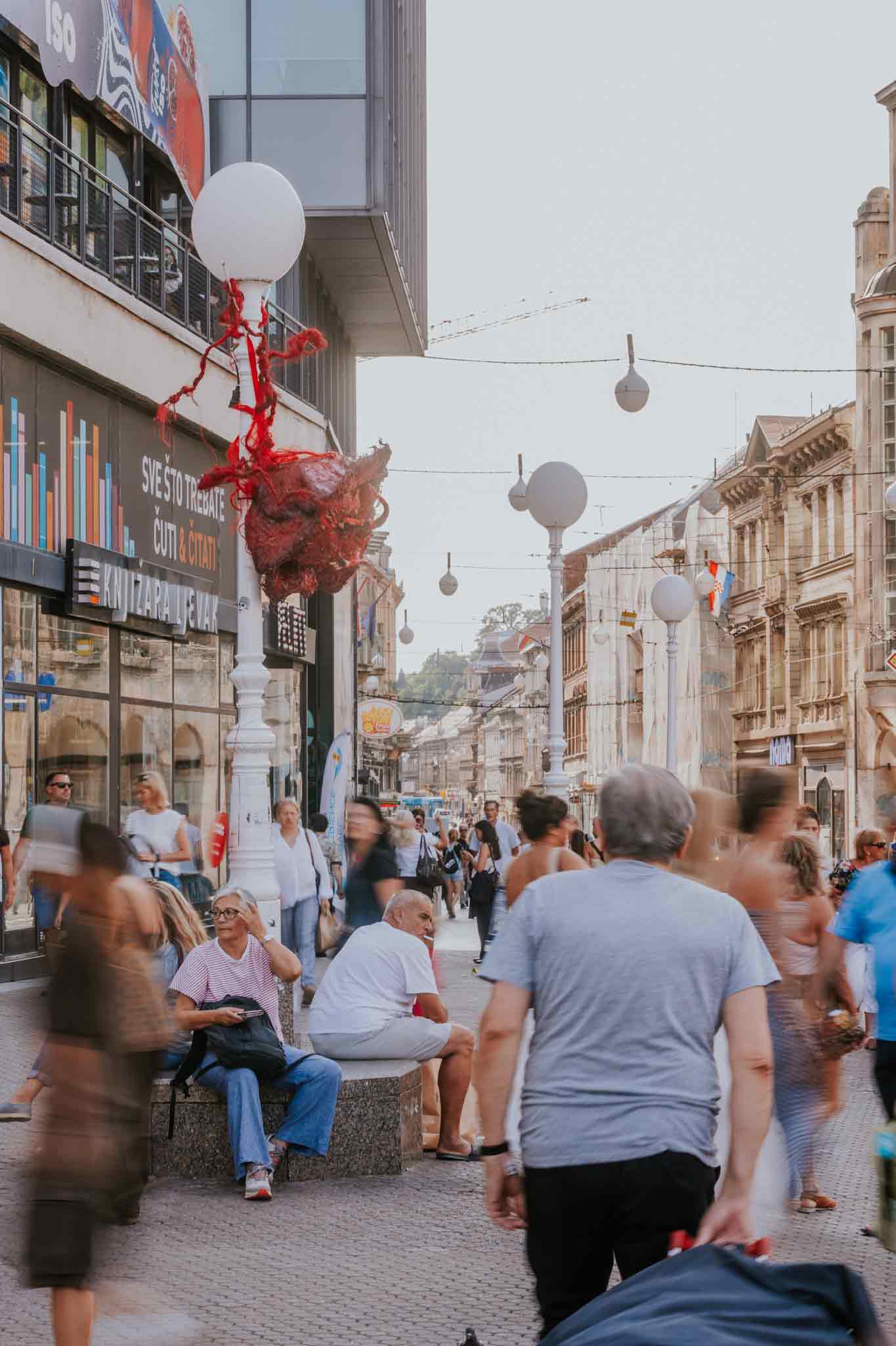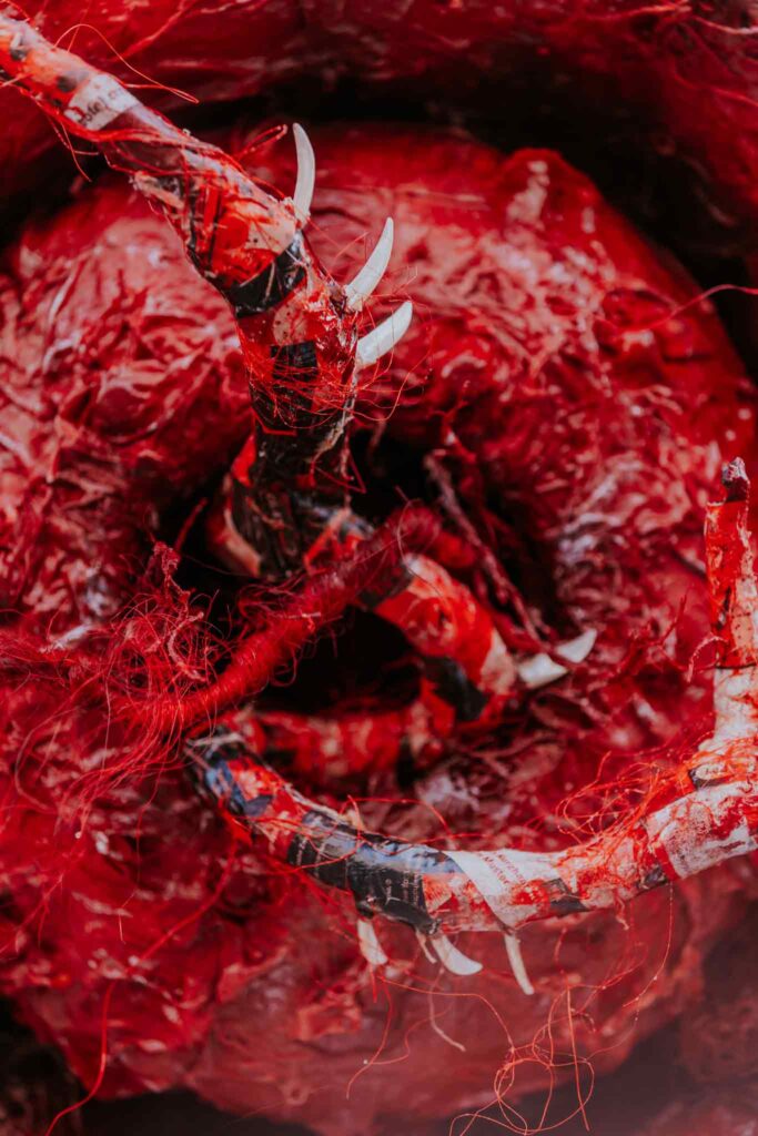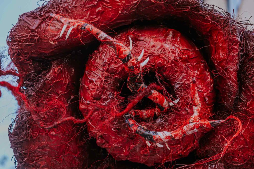 Trophilia envelops a lamp post and infiltrates like a parasite into the urban space. Fleshy red